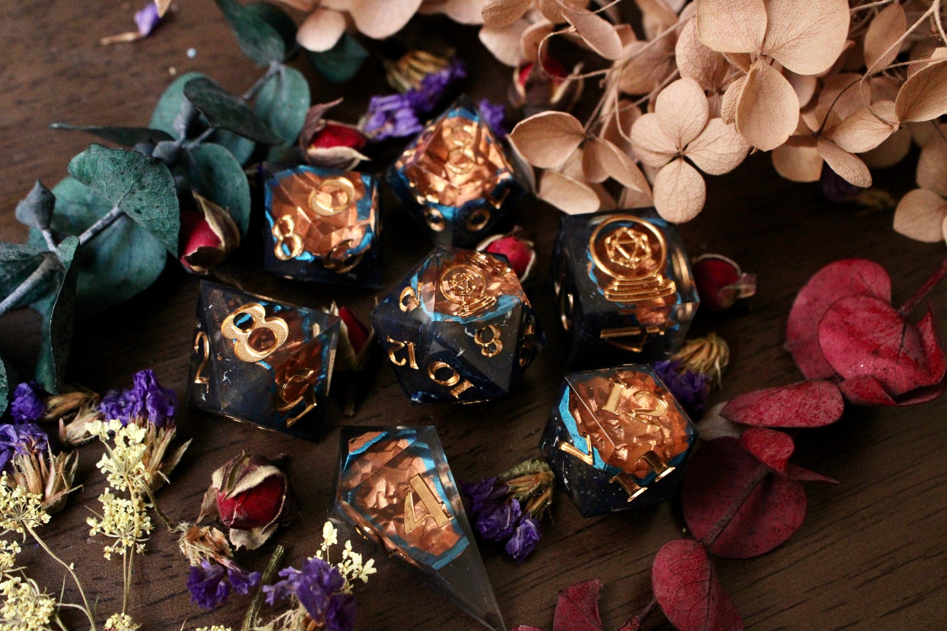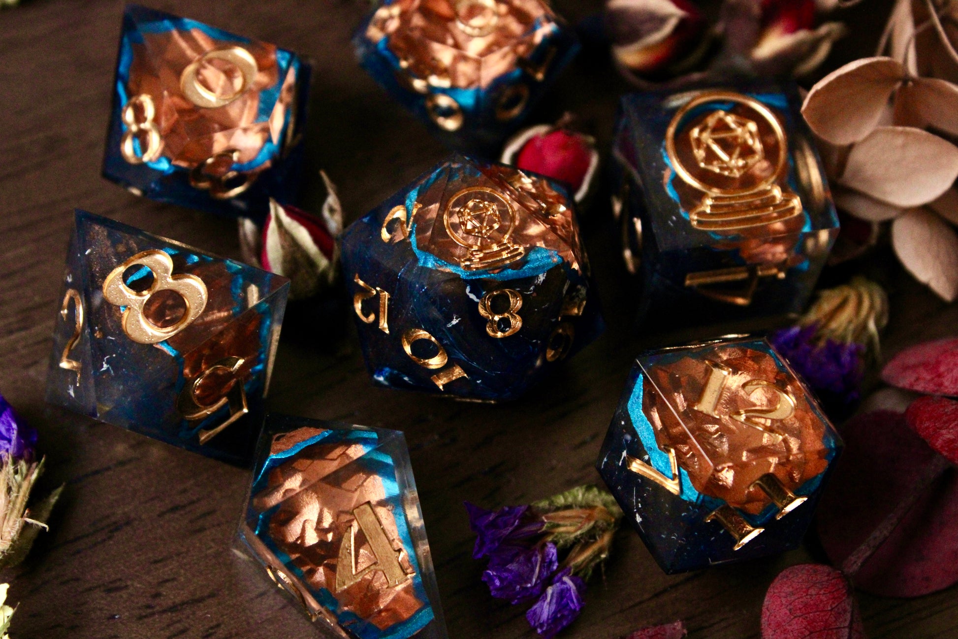 Materials may vary per set. Resin dice are made with Envirotex Lite epoxy resin. Dice may include various resin dyes, alcohol inks, resin pigment pastes, foil flakes, foil sheets, mica powders, glitter inks, and more.