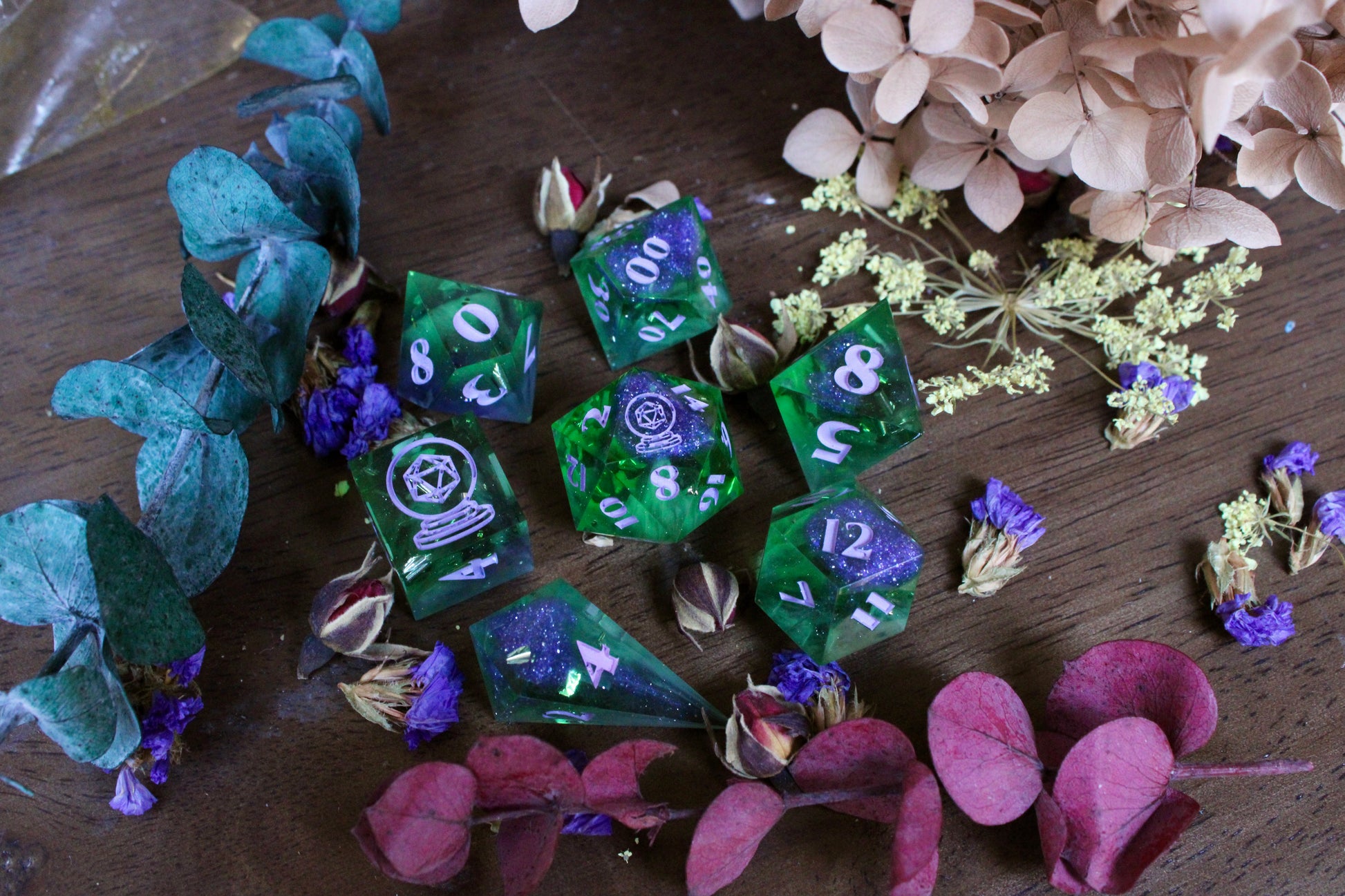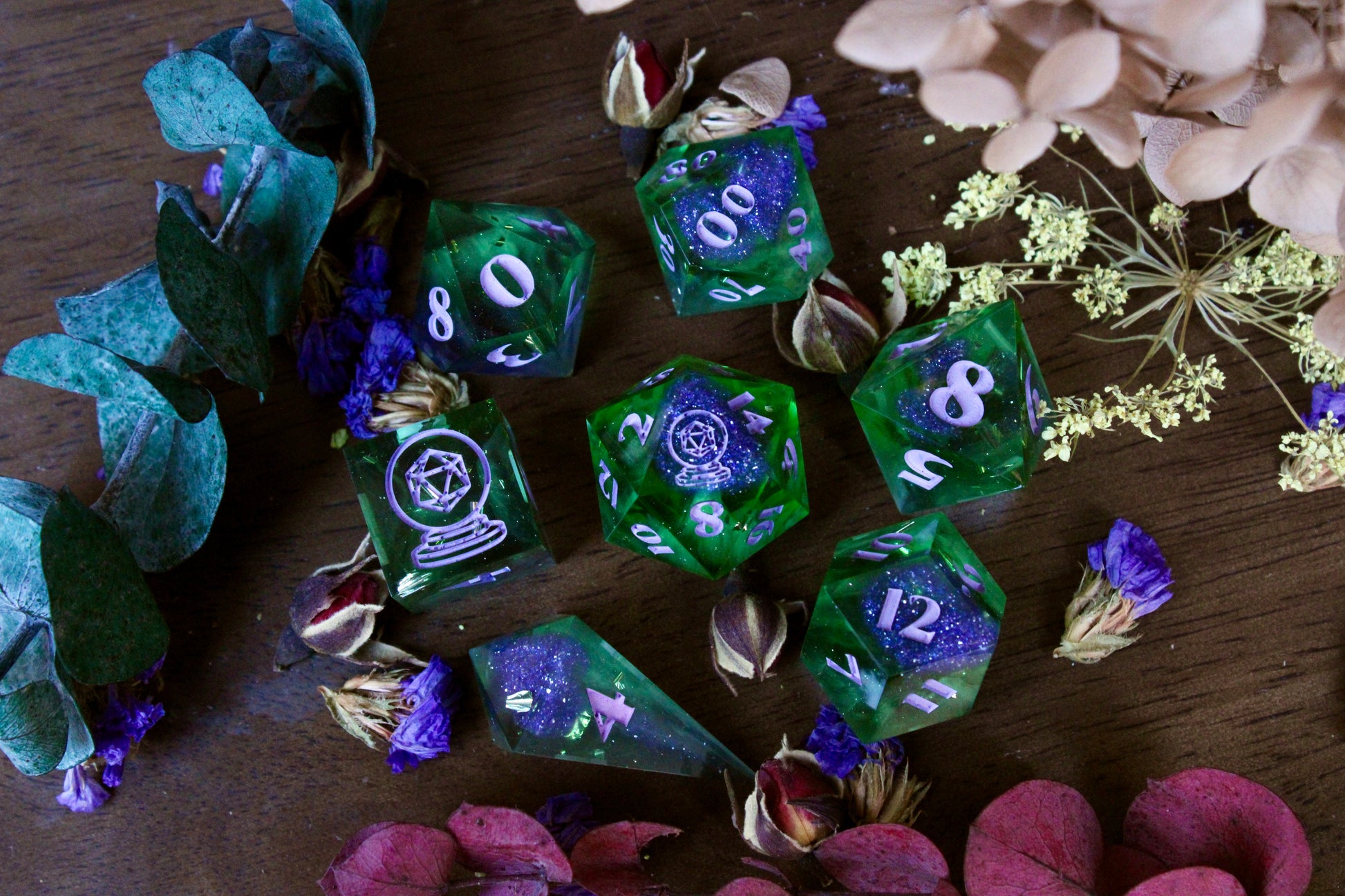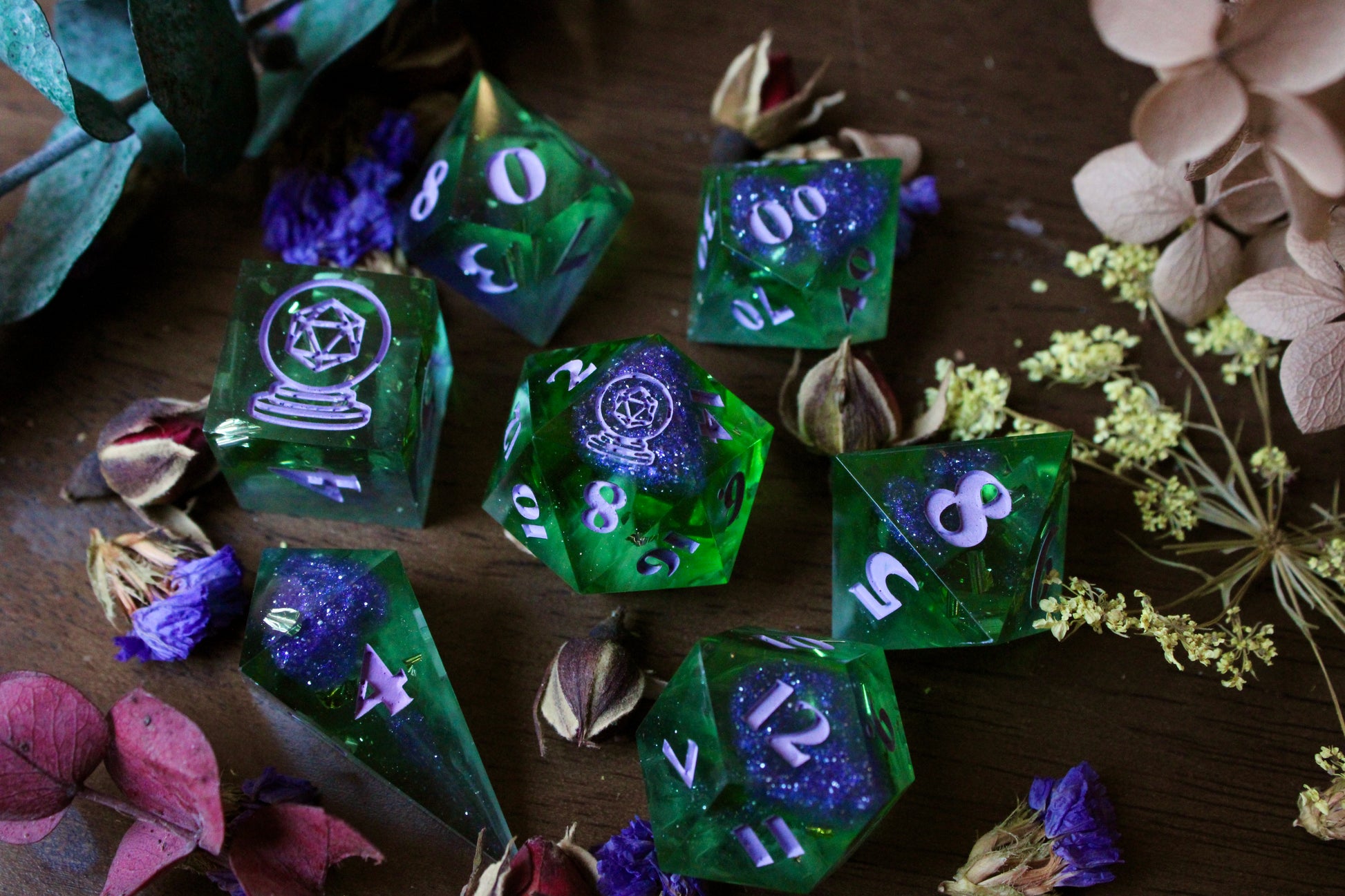 This seven-piece dice set is primarily a rich and vibrant green with small hints of white wisps, as well as touches of deep purple mica powder, mixed with macropearl pigment. The numbers are painted a matte, muted lavender paint.
