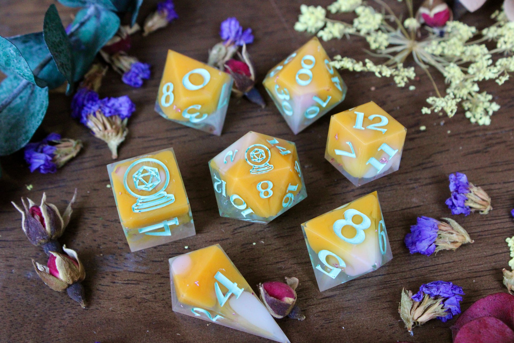 This seven-piece dice set actually has a faint translucent blue base, then filled out with white pink wisps and a rich orange pigment paste. The translucent areas are accentuated with blue macropearl. The numbers and symbols are painted with a matte mint blue.