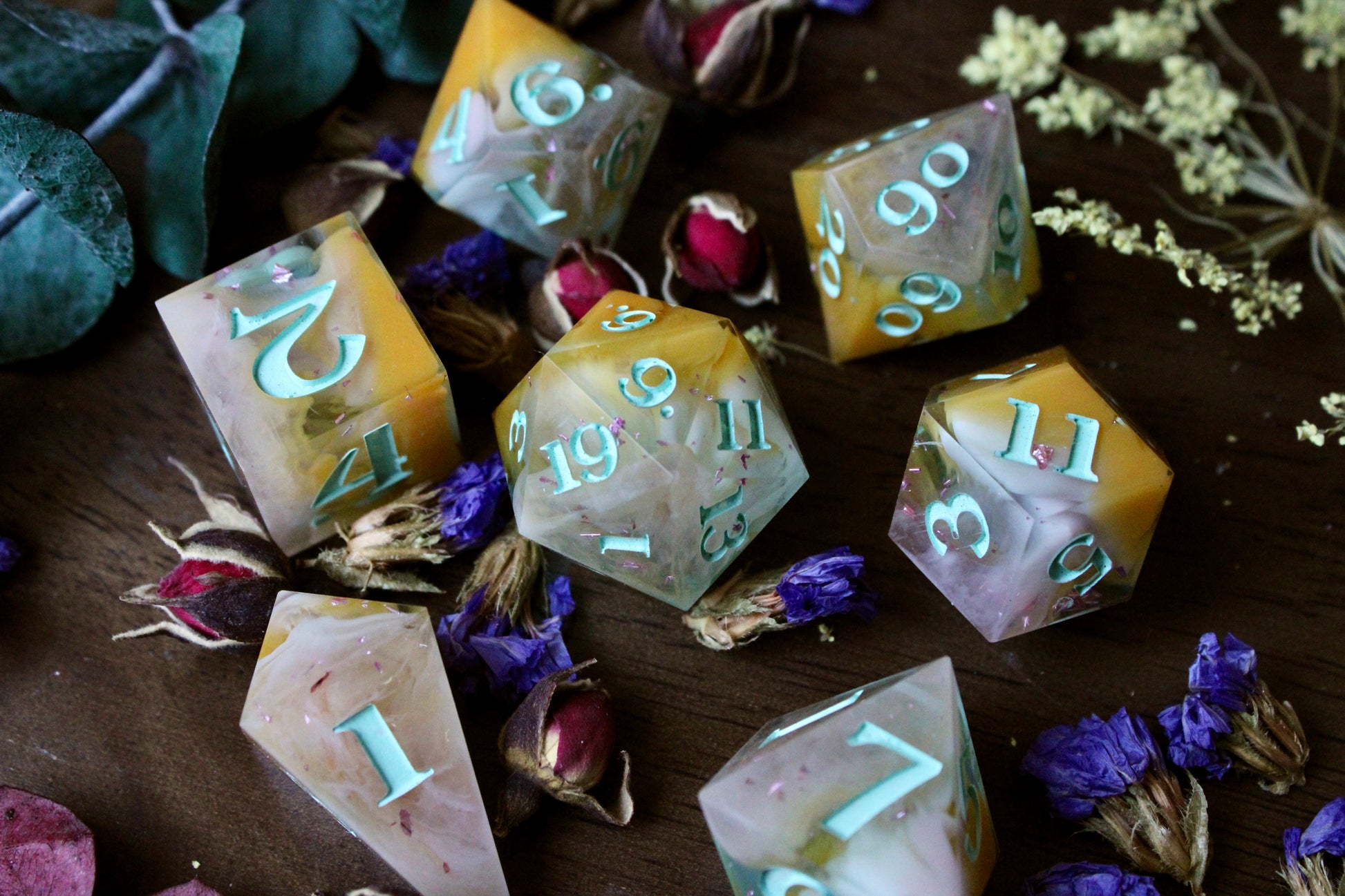 Materials may vary per set. Resin dice are made with Envirotex Lite epoxy resin. Dice may include various resin dyes, alcohol inks, resin pigment pastes, foil flakes, foil sheets, mica powders, glitter inks, and more.