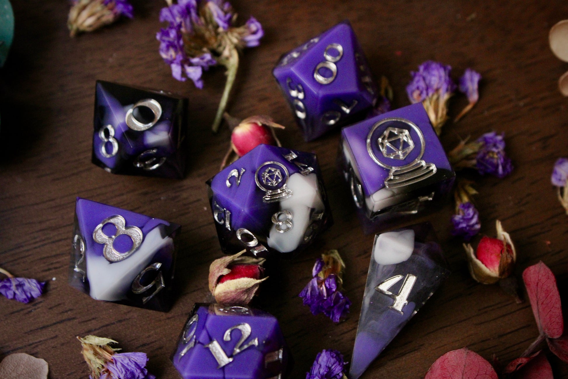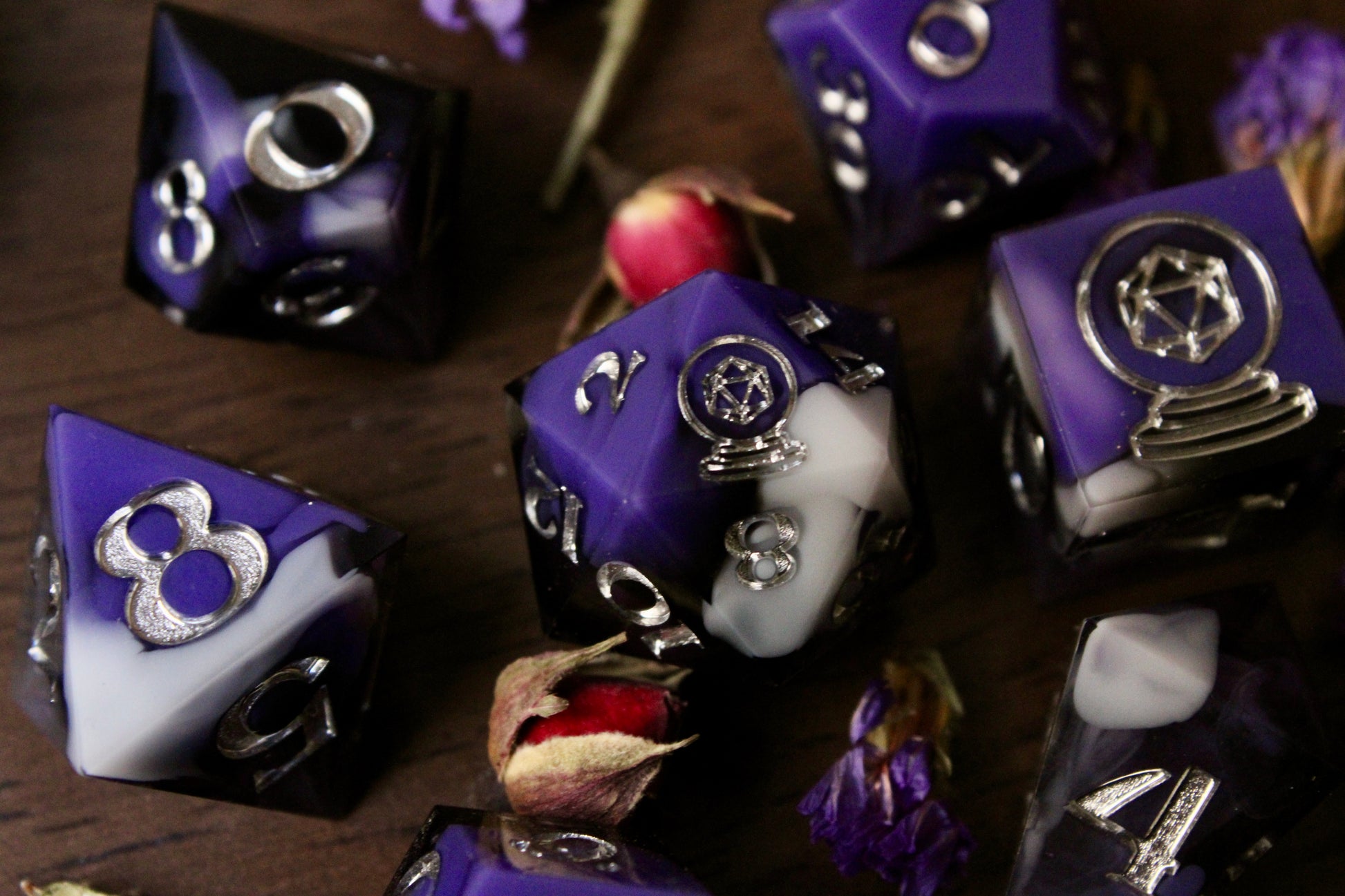 Materials may vary per set. Resin dice are made with Envirotex Lite epoxy resin. Dice may include various resin dyes, alcohol inks, resin pigment pastes, foil flakes, foil sheets, mica powders, glitter inks, and more.