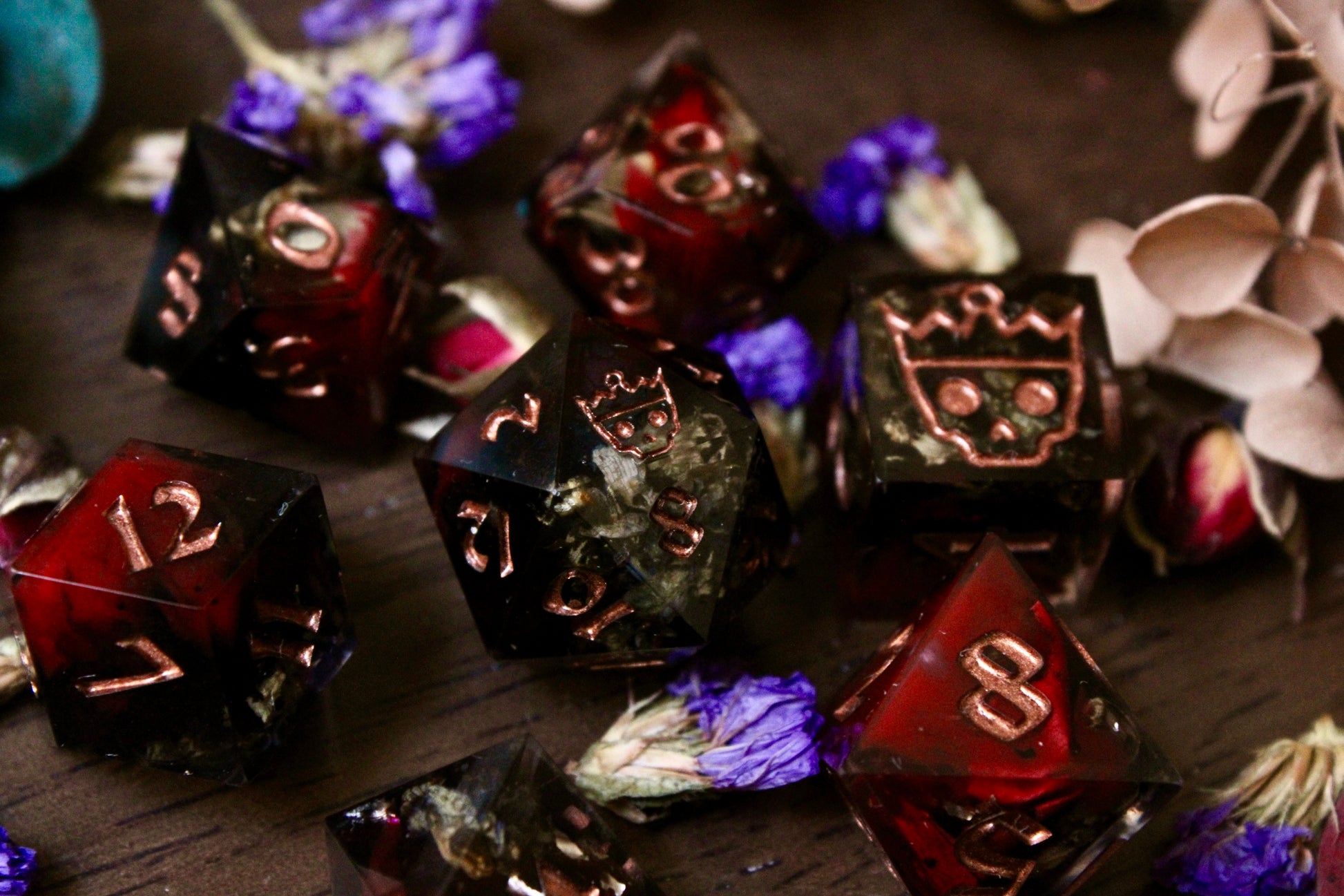This seven-piece dice set is primarily black with encased ivory and red rose petals, with opaque red paste dripping through. The numbers and symbols are painted with a rich chrome copper.