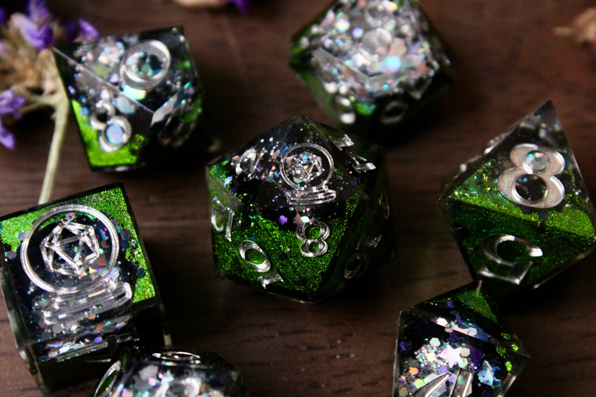 Materials may vary per set. Resin dice are made with Envirotex Lite epoxy resin. Dice may include various resin dyes, alcohol inks, resin pigment pastes, foil flakes, foil sheets, mica powders, glitter inks, and more.