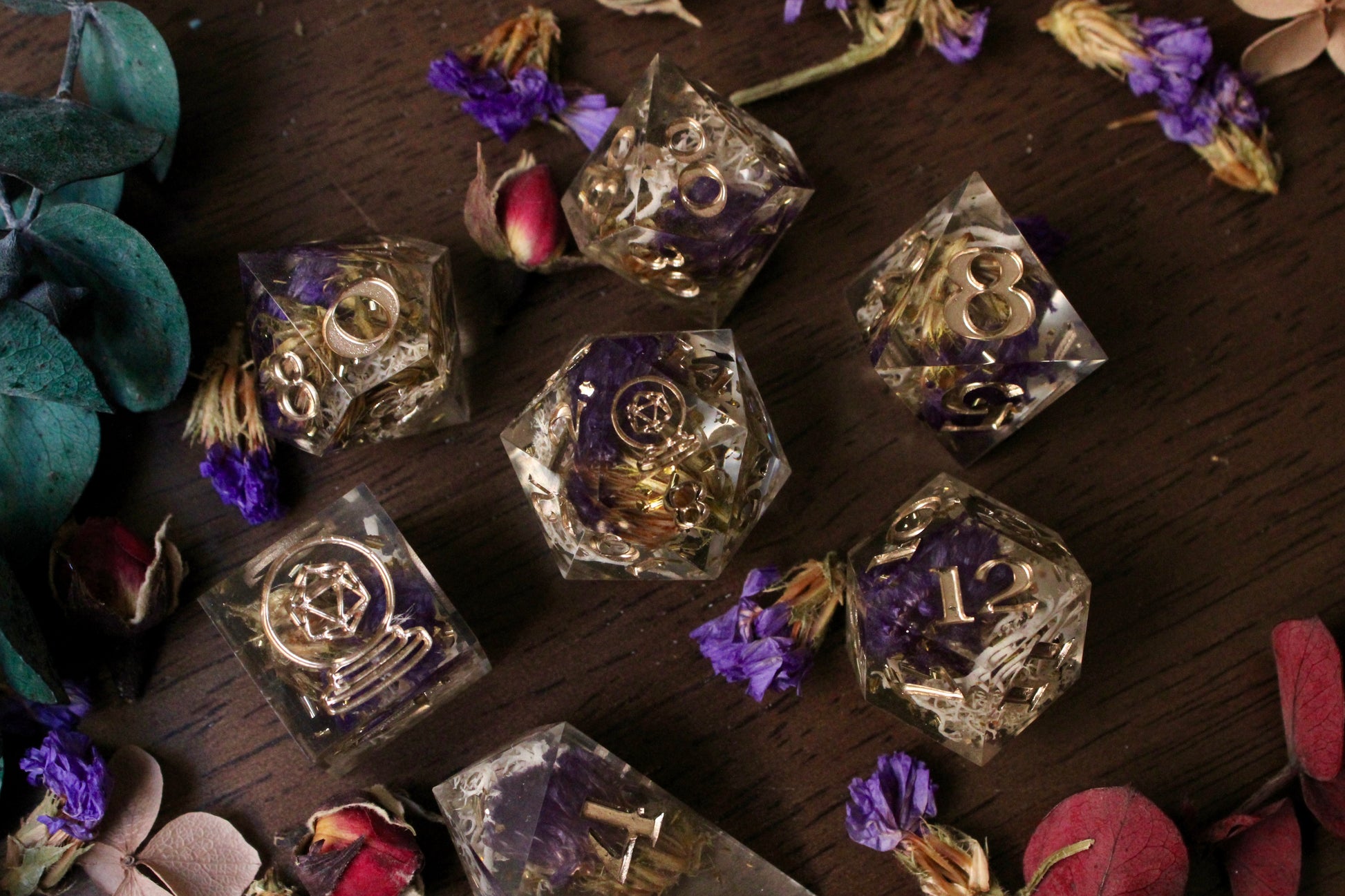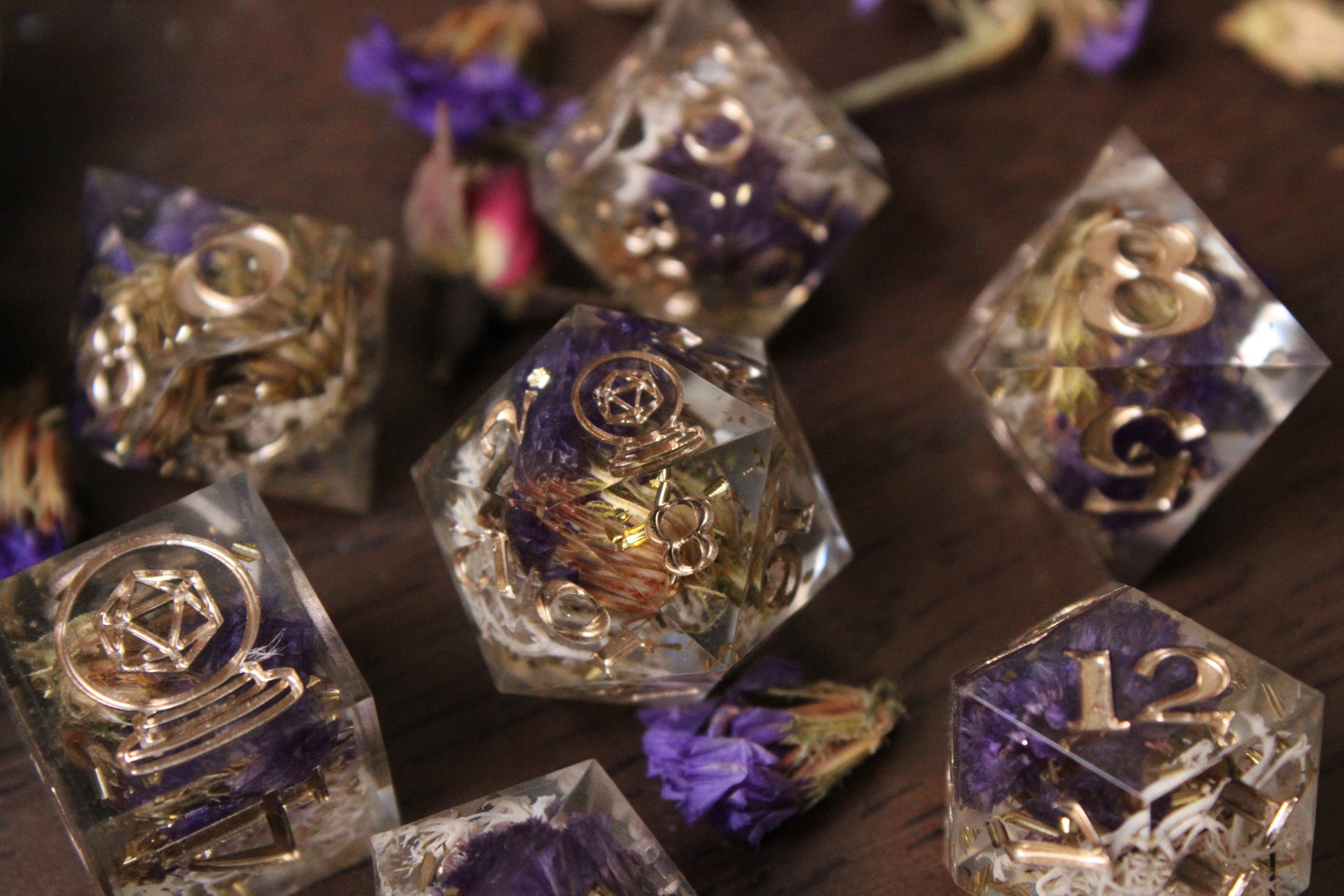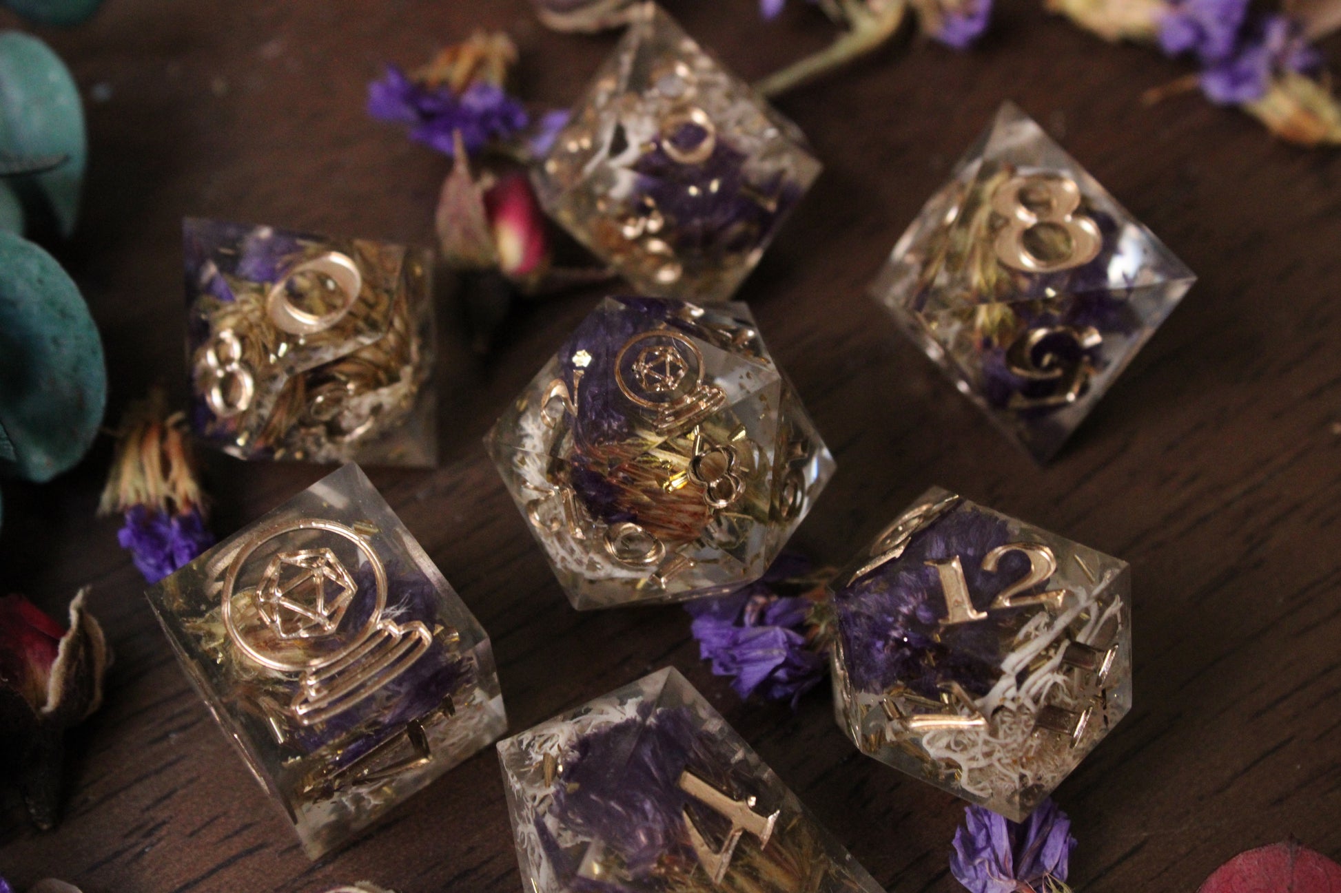 Materials may vary per set. Resin dice are made with Envirotex Lite epoxy resin. Dice may include various resin dyes, alcohol inks, resin pigment pastes, foil flakes, foil sheets, mica powders, glitter inks, and more.